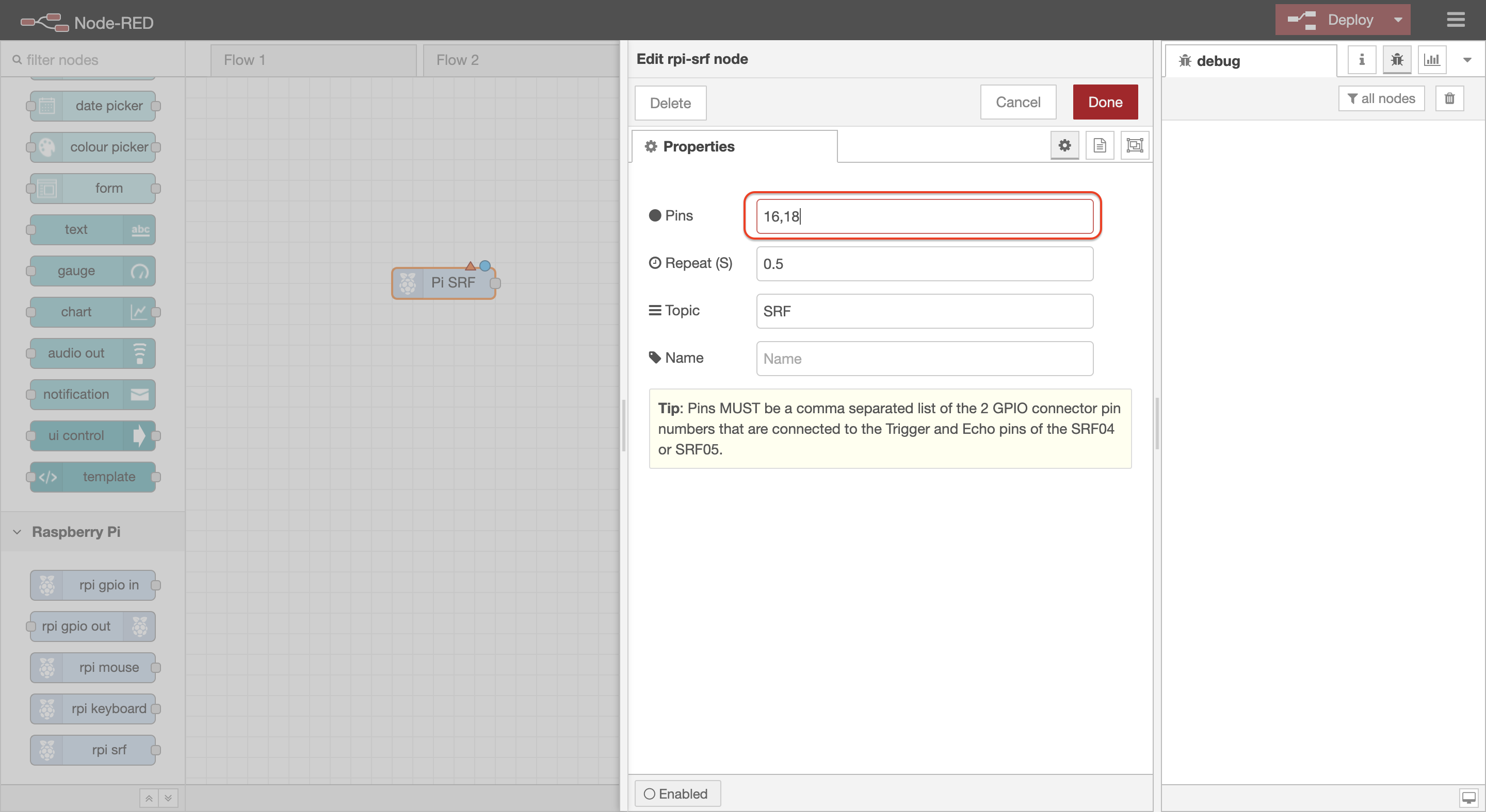 Drag and drop the rpi srf node in your canvas and configure it as follows