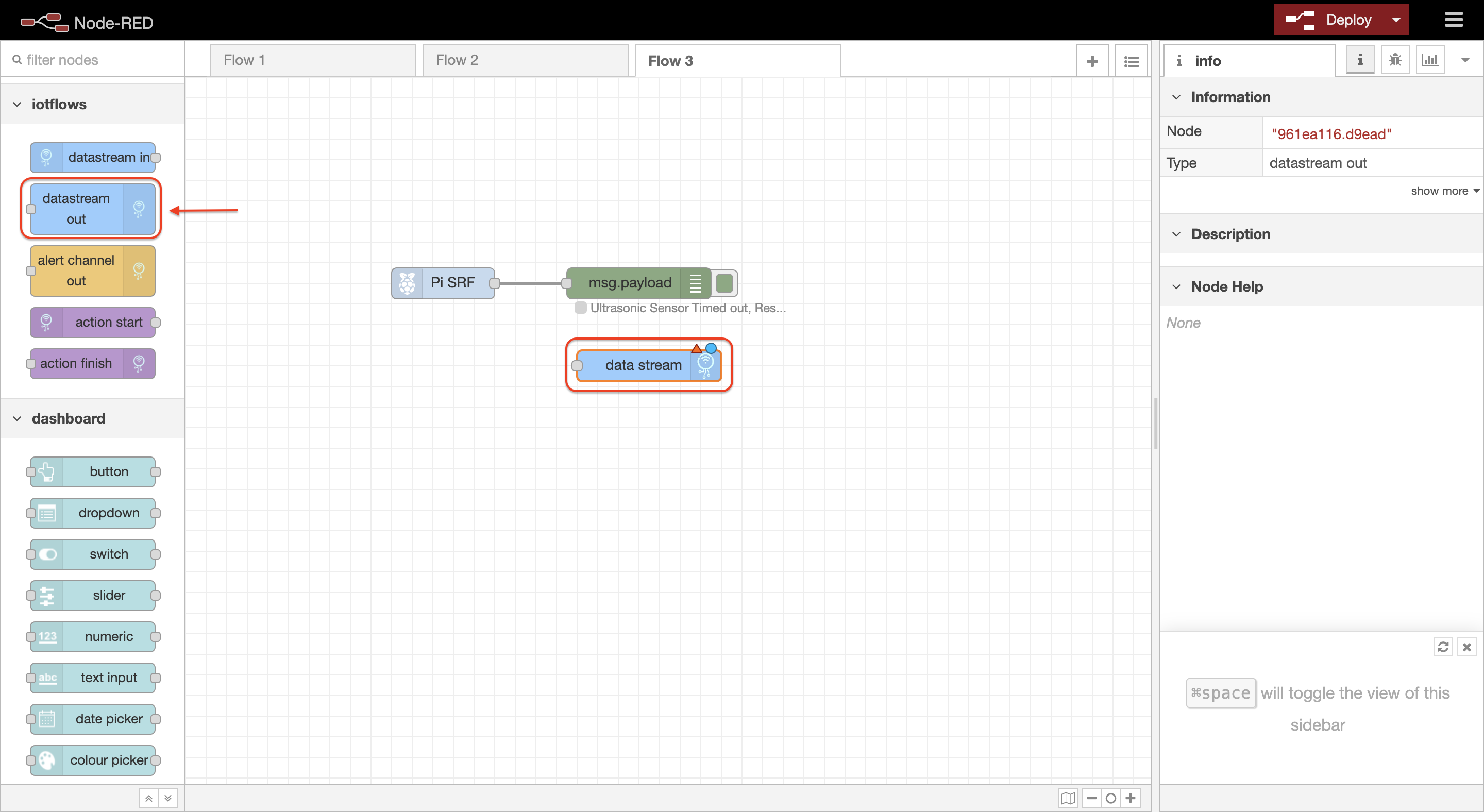 Next, connect your Pi SRF node to your datastream out node and click Deploy