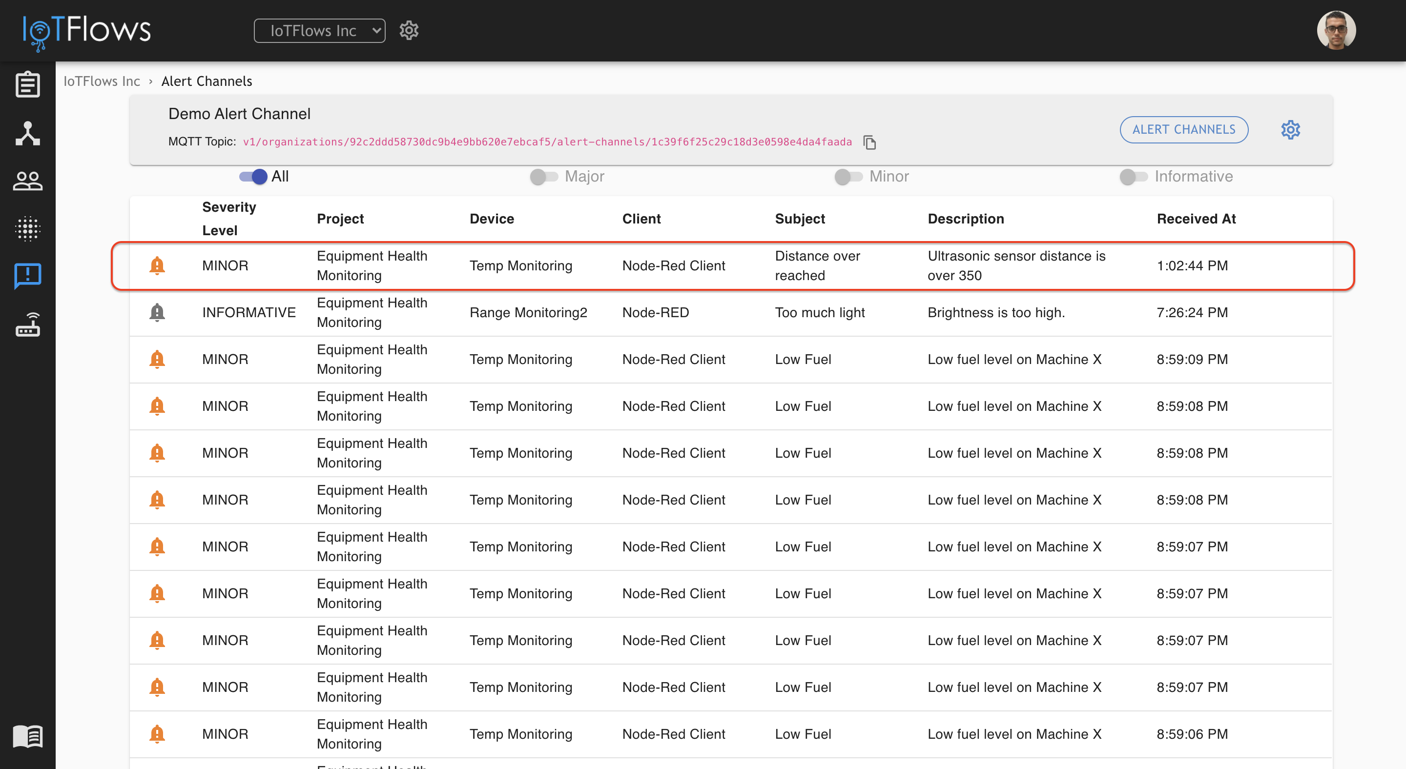 We can now go to our Alert Channel in the IoTFlows platform and view the alert message